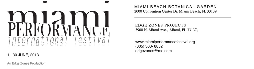 Edge Zones presenta la segunda edición del Festival de Performance Internacional de Miami del 1 - 30 de junio, 2013. M / P '13 es un emocionante programa de cuatro semanas de arte performatico acompañado de proyecciones de vídeos, charlas y talleres que culminan en un evento intenso de 4 días. El festival es una gran oportunidad para que el público se encuentre cara a cara con la amplitud y profundidad de las artes performaticas y ofrece obras viscerales y desafiantes de desempeño de artistas de 17 países de renombre, de mitad de carrera y de emergentes , así como más de 40 artistas nacionales y locales. Este evento anual ofrece un vistazo al proceso creativo a través de una variedad de medios de comunicación, presenta obras interdisciplinaria y trabajo colaborativo que hablan del alto nivel de la innovación, el pensamiento crítico y el compromiso social en Miami. La mayoría de eventos son gratis, pero la disponibilidad es limitada.